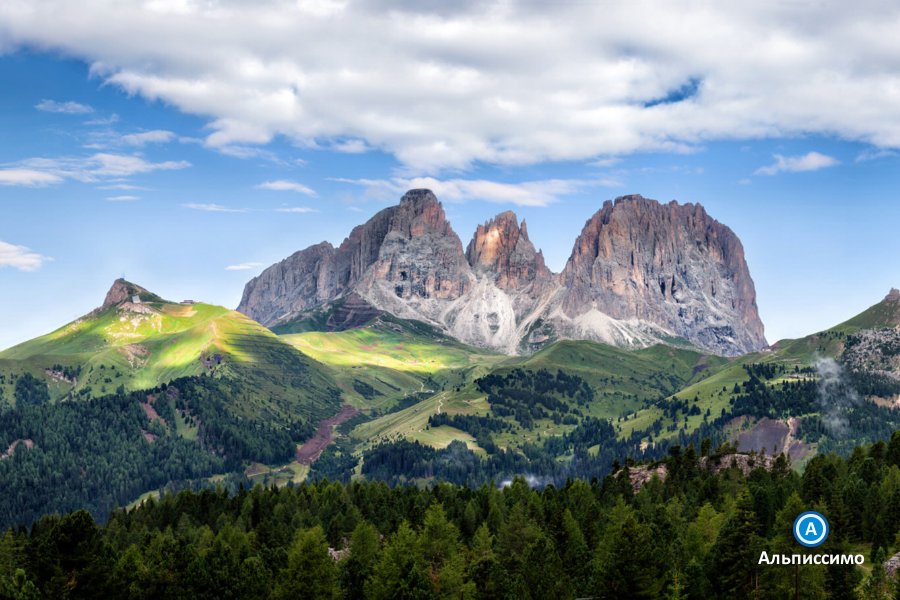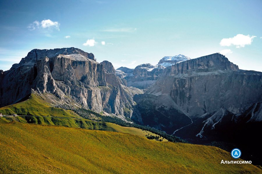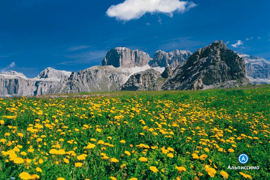 День 5: Вокруг массива СассолунгоПодъем 660 м, спуск 650 м. Протяженность 14 км. Время на маршруте 6 ч. Массив Сассолунго, что в переводе означает «Длинная скала», имеет легко узнаваемые контуры - он резко возвышается более чем на километр посреди зеленых высокогорных лугов. Сегодня у нас разгрузочный день - мы совершаем несложный переход вокруг Сассолунго с минимальным набором высоты. Это панорамный маршрут с множеством красивых видов соседних горных групп, долин Валь ди Фасса и Валь Гардена и гигантского плато Альпе ди Сьюзи. |