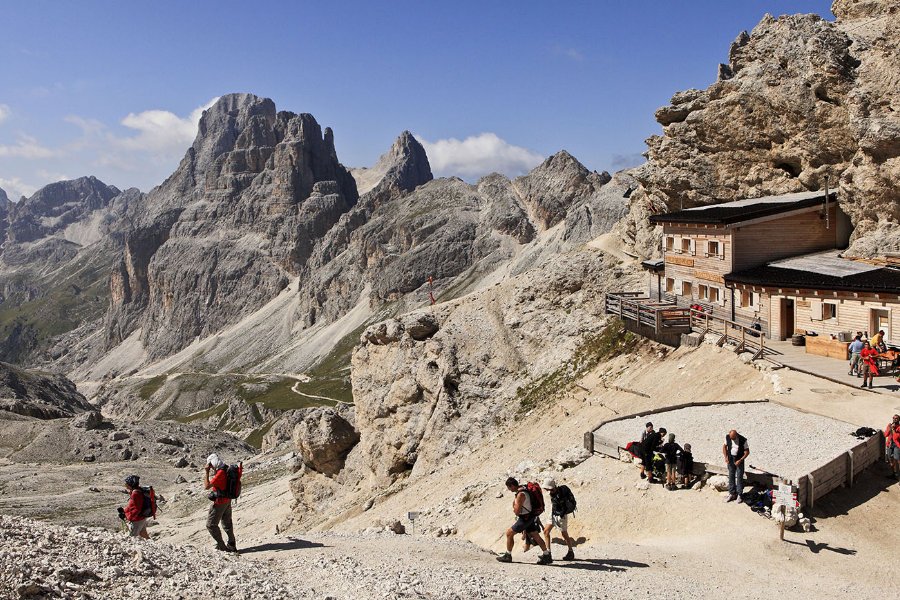 День 7: Массив РозенгартенПодъем 890 м, спуск 1170 м. Протяженность 12 км. Время на маршруте 7 ч. Название массива Розенгартен, в переводе - «Розовый сад», который сегодня лежит у нас на пути, дала старая альпийская легенда о короле Лаурино. Розенгартен представляет собой вытянутую с севера на юг горную цепь, образовавшуюся в древности как коралловый риф и сохранившую свою своеобразную форму до наших дней. Мы проходим по восточным склонам Розенгартена, затем поворачиваем в направлении Валь ди Фасса и спускаемся в долину по панорамной тропе перегонщиков овец, а затем через еловый лес и полные красок альпийские луга. |