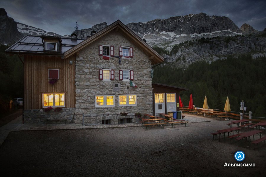 Ужин в горных приютах очень обильный. Он подается в фиксированное время для всех гостей - в 19:00 или 19:30. Традиционный ужин в приюте включает первое блюдо - паста, кнедлики, ризотто и т.п., второе блюдо - мясное с гарниром, десерт. Напитки за ужином следует заказывать дополнительно. Из напитков в приютах предлагается вода, вино, пиво, чай, кофе, соки, крепкие алкогольные напитки.