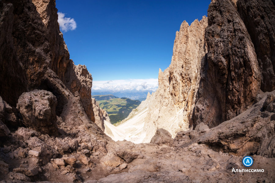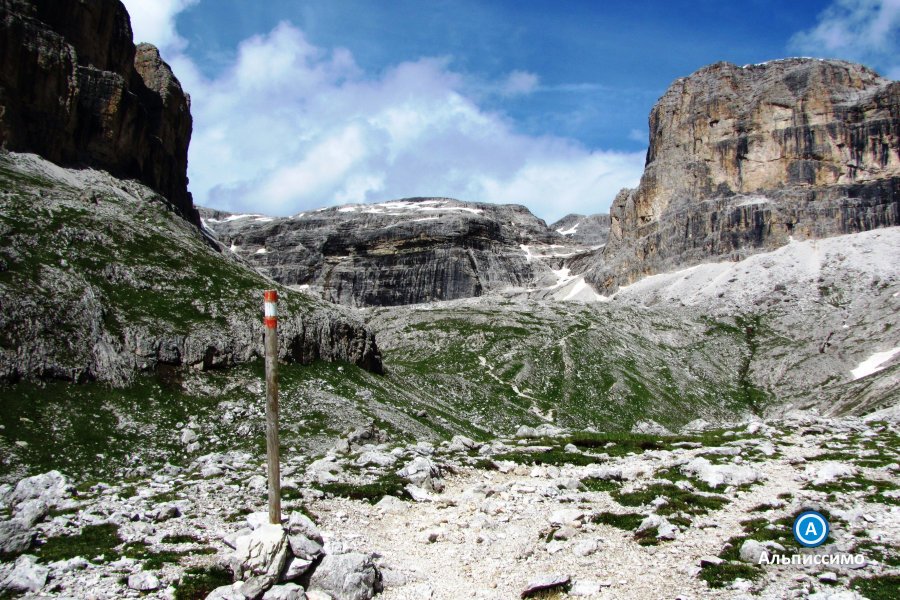 | День 3: Антермойя и переход через СассолунгоПодъем 1300 м, спуск 1500 м. Протяженность 19 км. Время на маршруте 8 - 9 ч. Сегодня маршрут проходит через пустынные перевалы и ущелья группы Антермойя. В глубине массива на дне ущелья лежит холодное озеро с кристальной водой, в которой отражаются облака и соседние вершины. Это озеро Антермойя - визитная карточка всей горной группы. В начале лета на склонах у озера сохраняются снежники, от которых отламываются куски льда и плавают по голубой глади озера, как айсберги. Из затерянного мира группы Антермойя маршрут ведет к компактному массиву Сассолунго, резко возвышающемуся над окружающими его высокогорными лугами. Переход через Сассолунго - это всегда маленькое приключение, которое не только дарит незабываемые впечатления, но и требует серьезных усилий на подъем. Сассолунго возможно перейти по единственному узкому ущелью в самом центре массива. График перехода выглядит так: крутой подъем, проход по ущелью - почти тоннелю, восхитительная панорама с перевала, крутой спуск. Сегодняшний маршрут очень протяженный, поэтому мы предусмотрели для участников похода возможность его сократить, приняв решение на основании времени прохождения контрольных точек. |