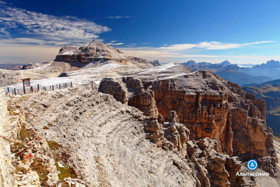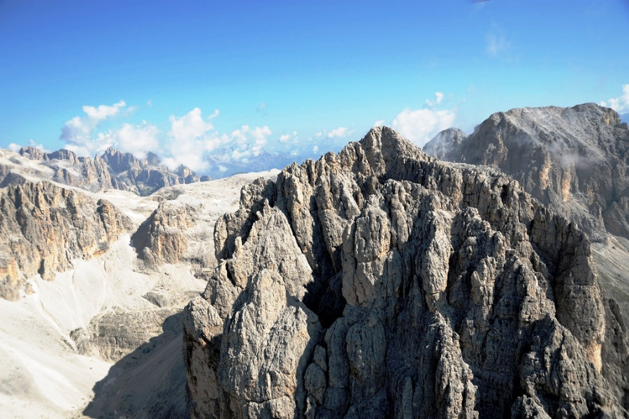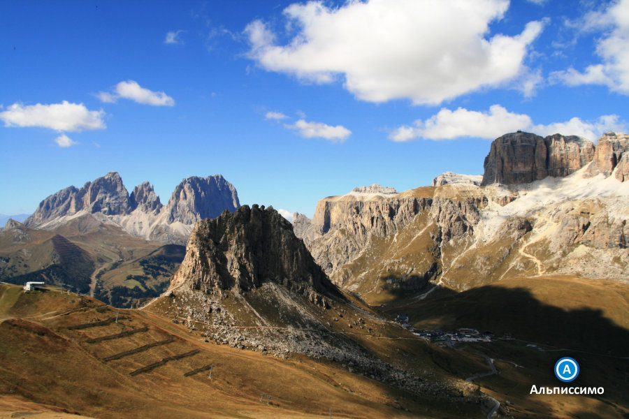 | День 4: Группа СеллаПодъем 1200 м, спуск 800 м. Протяженность 19 км. Время на маршруте 8 - 9 ч. Группа Селла - гигантский окаменелый коралловый остров древнего океана. Образовавшись, как и все Доломиты, 230 млн. лет назад, Селла примечательна тем, что подверглась минимальным разрушениям и сохранила почти идеальную форму тропического острова. Селла - массив с отвесными километровыми стенами по периметру, подняться на Селлу можно лишь в немногих местах. Мы поднимаемся по глухому живописному ущелью, заходящему почти в центр массива. Ущелье сильно сужается по мере подъема, по дну ущелья бежит горный поток, а уступы его отвесных стен образуют причудливые башни и арки. Поднявшись наверх, мы попадаем в характерный ландшафт Селлы, который обычно называют лунным - это каменистое и пустынное высокогорье без растительности и постоянных источников воды. Мы не завершаем наш день на Селле, а двигаемся дальше по открытым гребням хребтов к Мармоладе. На северных склонах Мармолады сохраняется единственный значительный по площади ледник Доломитов. Лучшие виды на ледник Мармолады - с нашей тропы по гребню; нам предстоит идти по ней более двух часов, и мы сможем рассмотреть ледник во всех деталях. |