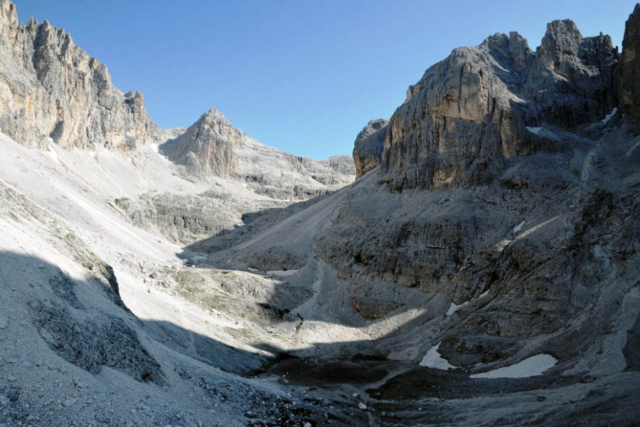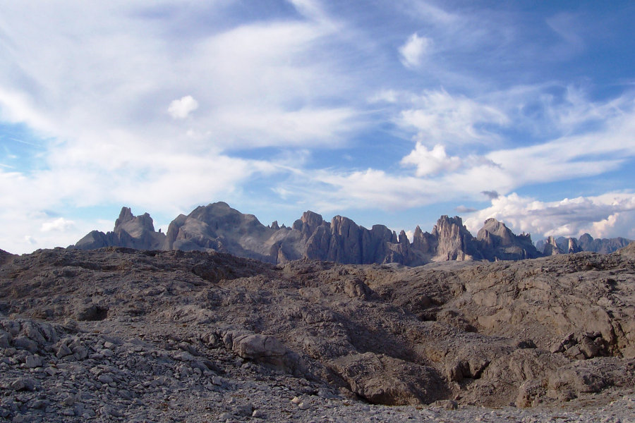 | День 8: Пале ди Сан МартиноПодъем 900 м, спуск 1300 м. Протяженность 20 км. Время на маршруте 8 - 9 ч. Высокогорное плато массива Пале ди Сан Мартино обладает одним из самых редких и удивительных ландшафтов на планете. Это более 50 кв. км пустынного относительно плоского рельефа на уровне 2500 – 2700 метров, сложенного преимущественно светло-серыми известняками. Здесь практически отсутствуют источники воды и, соответственно, растительность. Вода на плато появляется только в результате осадков и таяния нескольких ледников, лежащих преимущественно на склонах северной гряды. Через эти лунные пейзажи лежит наш путь сегодня. Рельеф плато не совсем ровный, он состоит из впадин, возвышенностей и неглубоких ущелий. С севера и юга плато зажимают сильно изрезанные труднопроходимые области с многочисленными пиками, возвышающимися над средним уровнем плато на 400 – 600 метров. Маршрут ведет нас сегодня на восточную оконечность плато – удивительно красивое место с грандиозной панорамой Доломитов соседней провинции Беллуно. |
