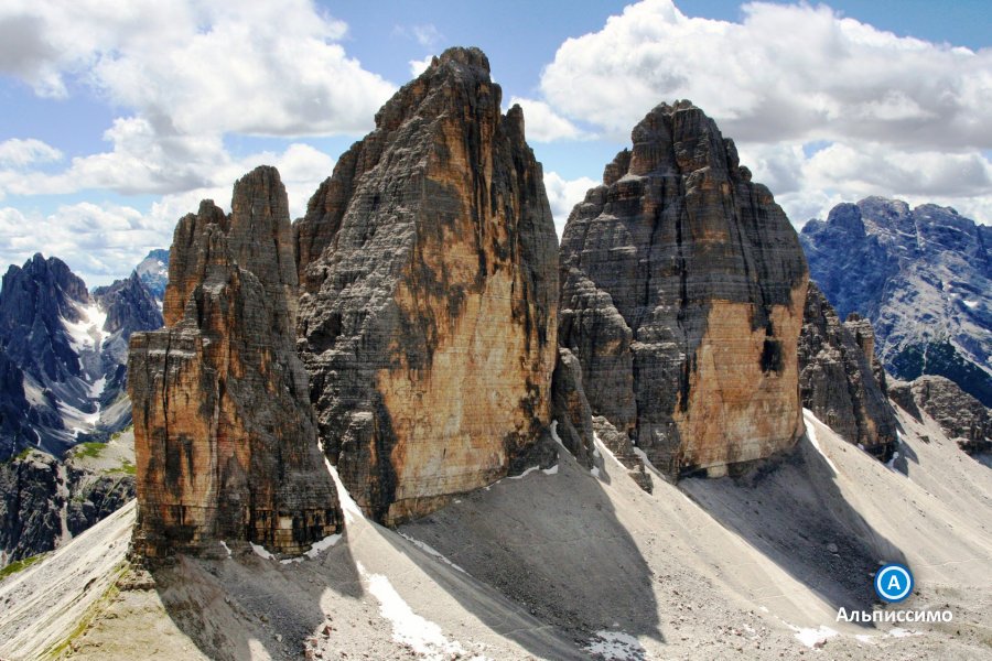 День 6: «Три Вершины Лаваредо»Подъем 1270 м, спуск 960 м. Протяженность 16 км. Время на маршруте 7 ч. Группа Tre Cime di Lavaredo или «Три Вершины Лаваредо» - одна из ключевых точек нашего маршрута. Это горная группа уникальной формы с тремя прижатыми друг к другу вершинами, возвышающимися над их основанием на 500 - 600 метров. Северные склоны этих вершин - отвесные стены, обращенные к котловине, со склонов которой мы будем наблюдать закат сегодня вечером. Мы приходим к «Трем Вершинам» в середине дня, поднимаясь из ущелья, где тропа проходит таким образом, что «Три Вершины» появляются неожиданно и затем постепенно открываются в полную высоту по мере нашего подъема. На ночь мы останавливаемся в приюте на склоне напротив «Трех Вершин», и сможем увидеть их не только на закате, но и утром, парящими над туманом, поднимающимся из ущелья. |