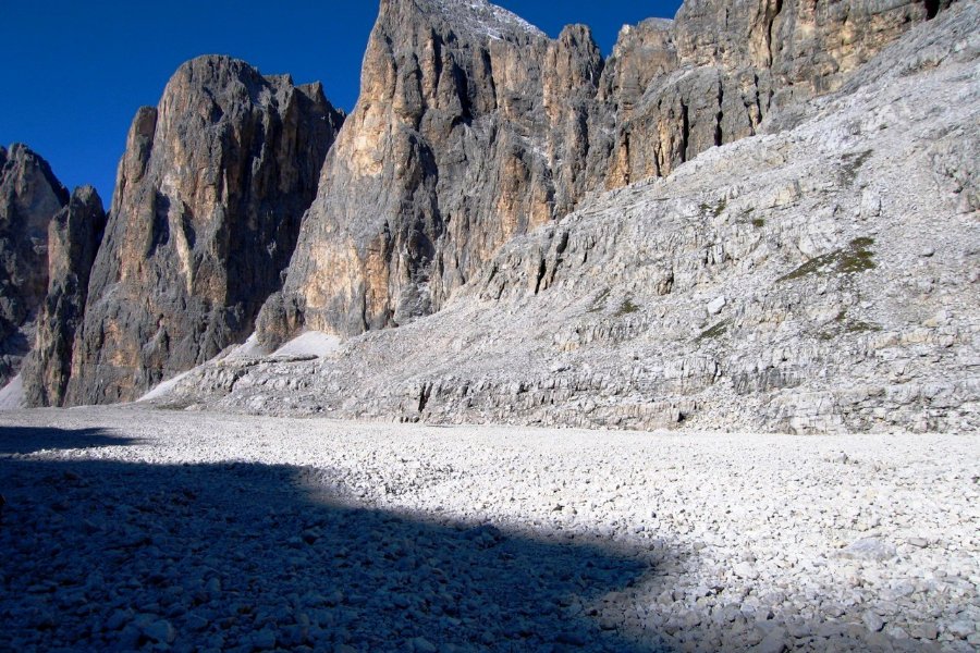 День 5: Переход через платоПодъем 1220 м. Спуск 270 м. Протяженность 10 км. Время на маршруте 6 ч. Сегодня маршрут пересекает плато с востока на запад. Это – наиболее протяженный дневной переход на маршруте. После подъема на перевал маршрут проходит параллельно восточному краю плато. Этот участок маршрута примечателен масштабной панорамой Доломитов с близко стоящей группой Чиветта-Мояцца. Постепенно углубляясь в центральную часть плато, тропа проходит через уникальный лунный ландшафт, которому группа Пале ди Сан Мартино обязана своей известностью. Это монолитная высокогорная область на уровне 2500 – 2700 метров, каменистая, практически безжизненная и лишенная растительности. Такие ландшафты очень редки, поэтому переход через плато неизменно оставляет сильные впечатления. |
